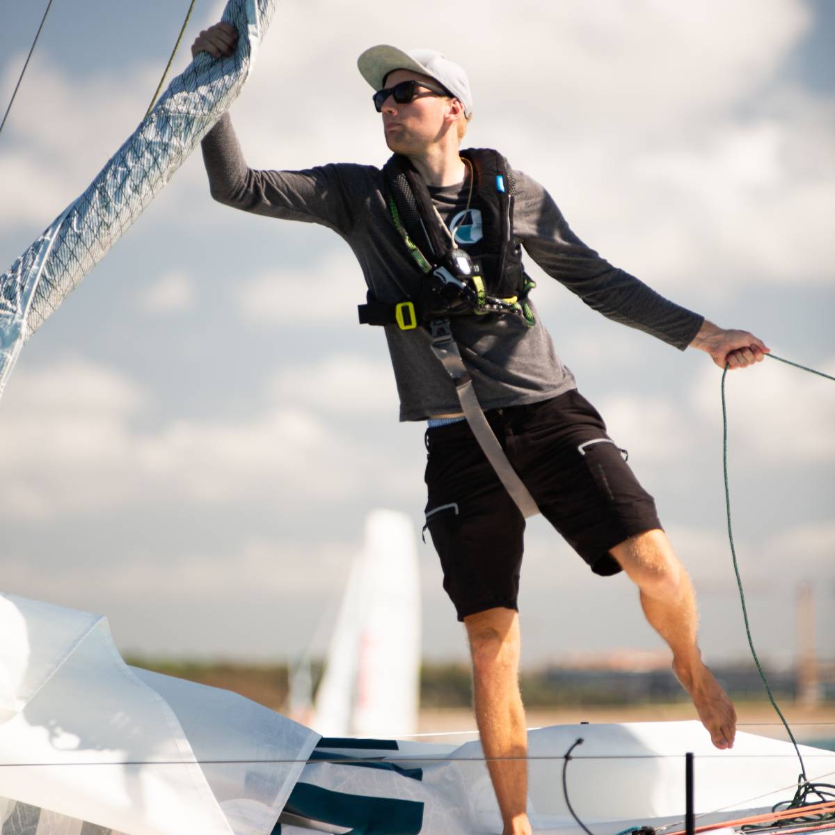 „Das wird ein bisschen komisch sein, wenn kein Rennen ist“, fasst er zusammen. Seit Freitag hatte er im Hafen von Cascais (Portugal) mit vielen anderen Teilnehmenden abgewettert, nachdem die Rennleitung die erste Etappe aufgrund von Hurrikan Gabriele, der auf die portugiesische Küste zusteuerte, abgebrochent hatte. Für Hendrik sicherlich sehr schade, lag er doch in der Serienwertung aussichtsreich auf Rang drei. Dennoch ist er guten Mutes und nimmt die Überführung mit Humor. „Wir haben nochmal frisch eingekauft. Alles, was man sonst nicht holt, Glasflaschen und so etwas. Das wird ein kulinarisches Highlight auf der Etappe“, berichtet er auf seinem Instagram-Kanal.