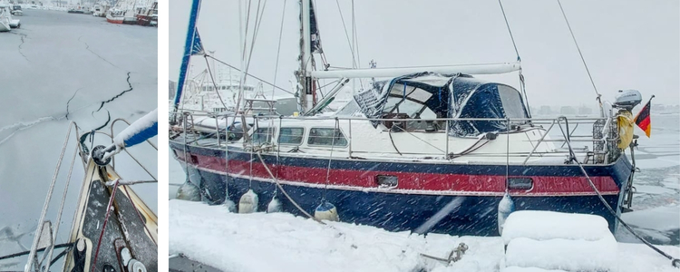 Über Nacht hat sich im Hafen eine feine Eisdecke gebildet. Die Rantje schiebt sich langsam Richtung Steg. Um sie herum knackt und ächzt das brechende Eis leise. Am Steg angekommen, suchen sie die unter der dicken Schneeschicht vergrabenen Klampen. Jede Bewegung kontrolliert und behutsam. Sie kennen den Steg nicht, wollen keine Spalten übersehen. Auch an Land herrscht Ausnahmezustand. Die Bevölkerung ist aufgefordert, zu Hause zu bleiben. Der Zoll klariert ausschließlich per Funk ein. Niemand kommt an den Steg zur Rantje. Die Insel empfängt sie vollkommen still – mit all ihrer rauen Schönheit.