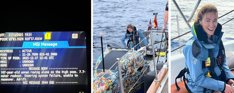 Nach Eingang der Distress-Meldung ändert die Yacht Raven den Kurs und nimmt die Solo-Ruderin Rebecca Ferry sicher an Bord. Fotos: Dietmar Henke