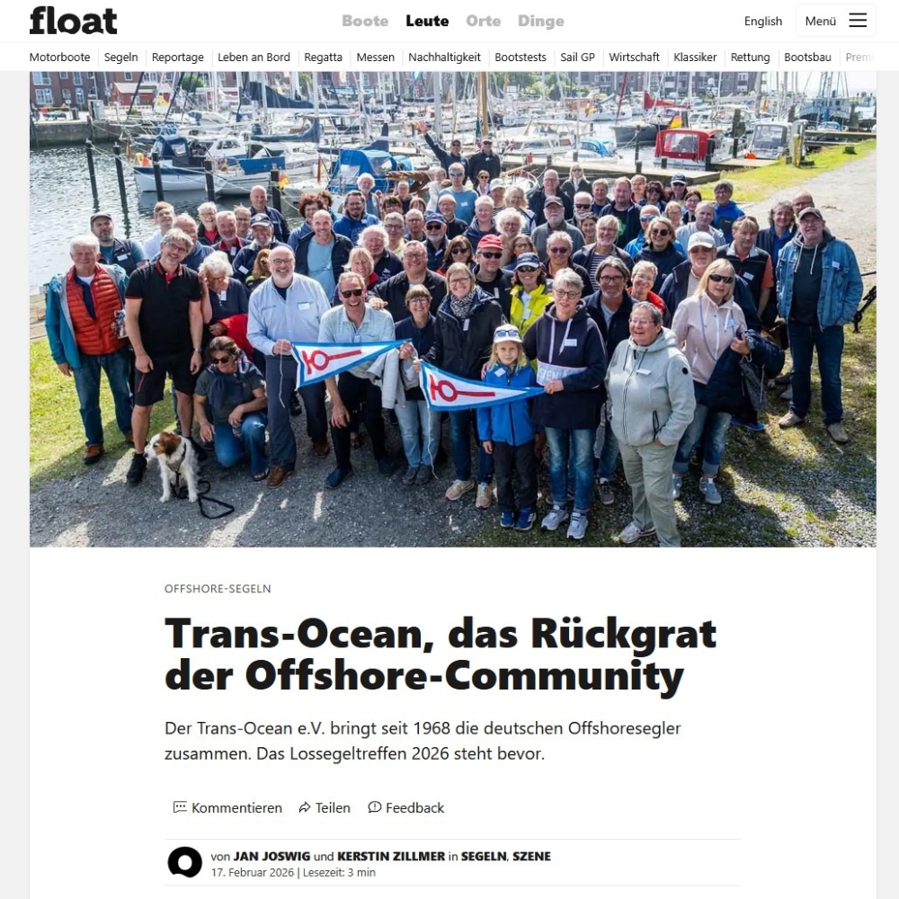 Das Float Magazin stellt in einem ausführlichen Beitrag den Trans-Ocean und seine Arbeit vor. Unter dem Titel „Trans-Ocean, das Rückgrat der Offshore-Community“ beleuchtet der Artikel die Rolle des Vereins als weltweites Netzwerk für Hochseeseglerinnen und -segler.