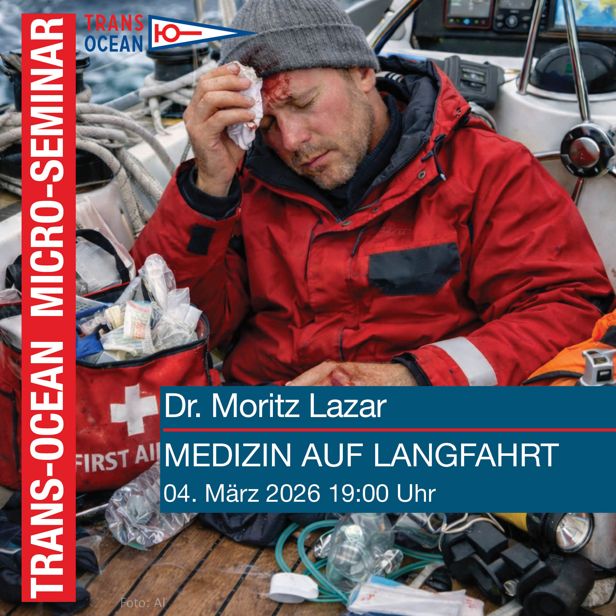 Im Micro-Seminar am Mittwoch, 04. März 2026, haben wir ab 19:00 Uhr Dr. Moritz Lazar zu Gast. Moritz ist nicht nur Internist und Notfallmediziner, sondern auch selbst auf dem blauen Wasser unterwegs und weiß dadurch, welche Möglichkeiten an Bord für die Versorgung medizinischer Zwischenfälle vorhanden sind. Neben einigen Grundlagen zur Prävention von Unfällen und den besonderen Risikofaktoren geht es an diesem Abend auch um die für Laien überhaupt sinnvolle Ausstattung einer Bordapotheke fürs Blauwassersegeln und einer praxistauglichen Notfalltasche an Bord.