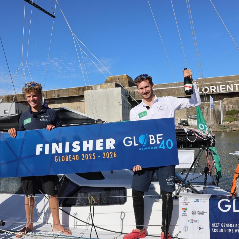 Starker Abschluss für das Team Next Generation Boating Around the World: Lennart Burke und Melwin Fink haben die sechste und letzte Etappe der Globe40 auf dem dritten Platz beendet. Nach 18 Tagen, 22 Stunden und 5 Minuten erreichten sie das Ziel in Lorient – erschöpft, aber stolz auf ihre Leistung. Den Sieg auf der Finaletappe sicherte sich das französische Team Crédit Mutuel, gefolgt von Belgium Ocean Racing auf Rang zwei. Next Generation komplettiert damit das Podium dieser anspruchsvollen Atlantiketappe.