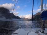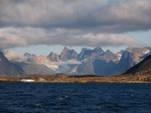 Schnell sind unsere Pläne für einen erholsamen Hafentag über den Haufen geworfen. Kurzentschlossen werden die Leinen losgeworfen. Nach einem Zwischenstopp an der Tankstelle, die hier die wenigen Autos und Boote gleichermaßen versorgt, geht es dann mit vollen Tanks Richtung Sund. Nebel und tief hängende Wolken geben nur wenige Blicke auf die Landschaft an der Südküste Grönlands frei. Die Eisberge fordern unsere Konzentration. Aber dann kommt die Sonne durch und vor uns öffnet sich die Aussicht auf eine grandiose Landschaft. Wir sind wieder einmal begeistert. Staunend fahren wir in den Sund ein. Links und rechts türmen sich die Felsen auf über 1000 Meter Höhe. An den Hängen schauen Gletscher hervor. Wasserfälle stürzen sich in die Tiefe. Nebelschwaden ziehen vorbei und wir gleiten durch eine Landschaft, die aus der Welt von Tolkiens „Herr der Ringe“ entsprungen sein könnte. Nach einigen Stunden kommen wir in den Seitenarm, den uns der Norweger als Übernachtungsplatz vorgeschlagen hat. Na ja, während wir von den angesagten sieben Windstärken aus Ost zwischen den Bergen nicht viel gemerkt haben, donnert hier der Wind durch ein Tal mit Sturmstärke – wir messen immerhin 49 Knoten Wind. Windstärke 10 und schwimmende Eisberge sehen nett aus, sind aber definitiv kein guter Ankerplatz. Also fahren wir weiter. Auf der Karte ist ein kleiner Ort mit Anleger eingezeichnet, Aappilattoq. Schon sehen wir die enge Einfahrt in den Naturhafen. Zwischen Felsen hindurch tasten wir uns an den kleinen Anleger und machen fest. Schnell sind wir umringt von einer ganzen Gruppe Kinder. Staunend wandern wir durch den Ort und auf den Hügel mit dem Hubschrauberlandeplatz. Wir setzen uns auf den blanken Fels und können uns an der imposanten Kulisse nicht satt sehen.