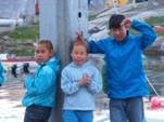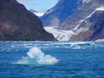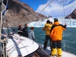 Abends beschäftigen wir uns mit den Kindern des Dorfes, spielen Fußball und Seilspringen. Wir finden im Schiff Wunderkerzen und begeistern die Kinder. Am nächsten Morgen besucht unser Junior (14 Jahre) mit einem Crewmitglied die örtliche Schule und erzählt über Deutschland. Dann geht es aber auch schon weiter in den Fjord. Zwischen hohen Bergen, begleitet von Gletschern und Wasserfällen, gleiten wir dahin. Irgendwann versperren Eisbrocken den Weg. Vorsichtig tasten wir uns ein Stück in das Eis hinein. Und dann beschließen die Jungs doch glatt: „Jetzt muss gebadet werden“. Gesagt, getan, schnell ist die Badeleiter ausgeklappt. Angegurtet wird kurz untergetaucht. Die Sonne scheint und unsere Rufe hallen über das Wasser. Nach der Aktion kehrt im Fjord wieder Ruhe ein. Wir tuckern weiter zum nächsten Gletscher und lassen uns davor treiben, schießen Fotos und bestaunen die Szenerie aus Eis und Felsen. Aber irgendwann drängt die Zeit. Wir wollen vor Sonnenuntergang an der Wetterstation am Ausgang des Prins Christian Sunds anlegen, um den Eisgürtel vor der Küste früh beim nächsten Tageslicht zu kreuzen.