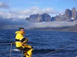 Auf geht es – auf nach Grönland - allerdings nicht auf direktem Kurs. Mit Nordwind segeln wir einen Tag in Richtung Osten. Irgendwann dreht der Wind und wir nehmen Kurs Nord. Das ist endlich richtiges Segeln. Mit 25 Knoten Wind von achtern kommt die HUNDERTWASSER auf rund 10 Knoten, und das über mehrere Tage. Mit Tagesetmalen von knapp über oder unter 200 Seemeilen nähern wir uns Grönland. Das Boot fährt unter Passatbesegelung wie auf Schienen und wir baden in Shrimps. Immerhin müssen wahre Berge davon verputzt werden. Und dann kommt das Elchfleisch an die Reihe. Eigentlich hatten wir doch mit ständigen Nudelgerichten gerechnet. So gehen die Tage dahin. 40 Meilen vor Grönland sichten wir unseren ersten Eisberg. Was für ein Erlebnis! Und dann kommt der Nebel. Wir tasten uns mit Radar und doppeltem Ausguck zwischen den Eisbergen hindurch und fragen uns, wie das wohl in der Einfahrt nach Nanortalik aussehen wird. Aber dann, kurz unter Land lichtet sich der Nebel. Vor uns tauchen von der Sonne hell angestrahlte Eisberge vor einer imposanten Bergkulisse auf. Wir können uns nicht satt sehen und fahren vorsichtig zwischen den weißen Kolossen hindurch bevor wir im Örtchen Nanortalik an einem Schwimmsteg festmachen. Wir haben es geschafft. Seit Neufundland liegen 785 Seemeilen hinter uns. Grönland ist erreicht. Der Skipper meldet uns auf der Polizeistation an und wir streunen begeistert durch den Ort. Abends gehen wir zum Essen in ein Hotel. Dort genehmigen wir uns erst einmal das eine oder andere Bier. Mit dem Essen ist es allerdings nicht weit her. Wir haben uns nicht angemeldet und so gibt es nur asiatische Nudelsuppe aus der Packung. Was soll es? Sieben asiatische Nudelsuppen bitte! Inzwischen versuchen die im Hotel anwesenden Einwohner von Nanortalik mit uns zu kommunizieren. Das fällt allerdings aufgrund deren zunehmenden Alkoholkonsums und unserer mangelndem Dänisch Kenntnissen nicht leicht.