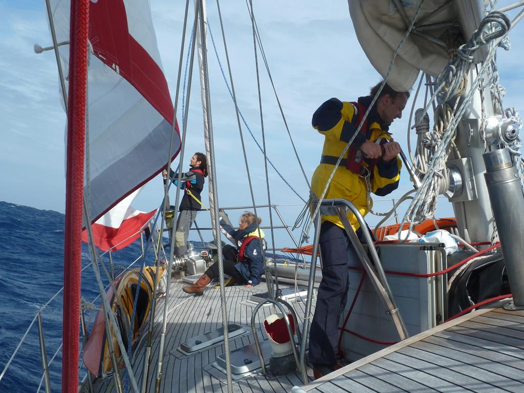Wieder nur unter gereffter Genua. Zu Beginn der Reise hätte ich nicht gedacht, dass wir zwei Drittel der gesamten Reise nur mit Vorsegel fahren würden! Immerhin wiegt die Santa Maria Australis 40 Tonnen und wir laufen jetzt im Schnitt 6 bis 7 Knoten, oft auch mehr. Morgen Abend soll schon wieder das nächste Tief durchkommen. Mich lässt das relativ kalt. Reffen wir halt ein bisschen mehr und in der Messe läuft man eben nicht mehr auf rutschigen Socken. Und ansonsten: Aussitzen! Egal, wie das Wetter ist, wir versuchen Normalität zu leben zwischen Koje, Cockpit, Kombüse und wieder Koje und signalisieren damit Kopf und Seele: „Alles ist im grünen Bereich! Alles ist in Ordnung! Kein Grund, sich Gedanken zu machen!“ Selbst das ewige Getöse von losen Teilen in den diversen Schapps hört man irgendwann nicht mehr, obwohl der Lärm von Kochgeschirr und Co. zeitweise wirklich schlimm ist.