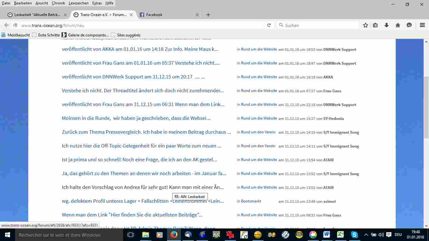 Das ist ein Screenshot vom Läptop. Ich finde den Informationsgehalt nicht wirklich berauschend. Entweder kommt (m)ein nichtssagender Satzanfang "Wenn ich dem Link folge" oder es kommt Ihr "von DNN... beigetragen" und gar nichts Inhaltliches. Da wäre mir persönlich dann der Threadtitel lieber und wenn der sich nun wiederholt, dann weiß man zumindest, dass es sich um einen aktiven Thread handelt. Noch eine Frage: Ist die Möglichkeit, andere als Bilddateien hochzuladen verschwunden oder nur noch nicht wieder verfügbar? Ich dachte an informative pdfs o.ä.