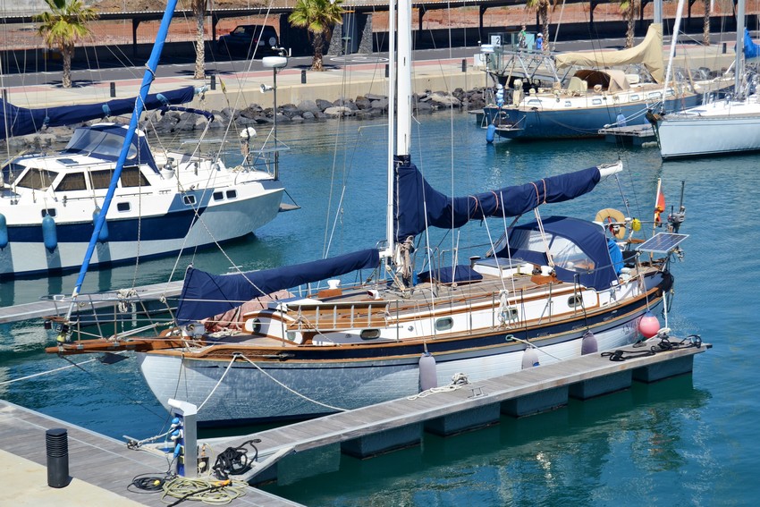 Design Robert Perry, gebaut 1980 in Taiwan, Baunummer 198 von ca. 600. Mit ihrem Langkiel, Kanuheck und Kuttertakelung ist sie ein sehr stabiles und komfortabel segelndes Schiff. Ihr klassischer Innenausbau aus massivem Teak, mit reichlich Stauraum und viel Atmosphäre macht sie auch sehr angenehm zum Leben an Bord. Das relativ kleine Cockpit mit fester Reling, der äußerst massive Rumpf (Gfk), das Teakdeck und der Segelplan mit 3fach reffbarem Großsegel, Stagfock und Yankee (mit Rollreff) sorgen für Sicherheit unter
