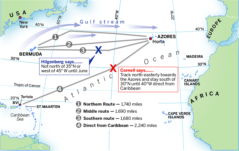 ich habe im Winter 2015 meine 37 Fuß OVNI von Europa über die Kanaren und Kapverden in die Karibik gesegelt. Nun möchte ich das Schifferl für die Saison 2017 wieder ins Mittelmeer überstellen. Nach einigen Wochen Island Hopping wäre der Absprung Mitte Februar geplant. Als Route hätte ich die von Cornell vorgeschlagene "Direkt-Route" gewählt d.h. ab Antigua NO Kurs um bis auf 40° West südlich des 30. Breitengrads zu bleiben. Von dort dann direkt Kurs auf die Azoren. Ich würde - vor allem aufgrund der Wettersituation in den nördlicheren Breiten des Atlantiks - dieser Route den Vorzug über den "Standardrouten" via den Bermudas geben. Die Bermudarouten würden zwar mit halbwegs stabilen Westwinden locken, dafür ist auch die Wahrscheinlichkeit höherer See umso größer. Aufgrund der doch eher geringen Bootslänge möchte ich allzu große See eher vermeiden.