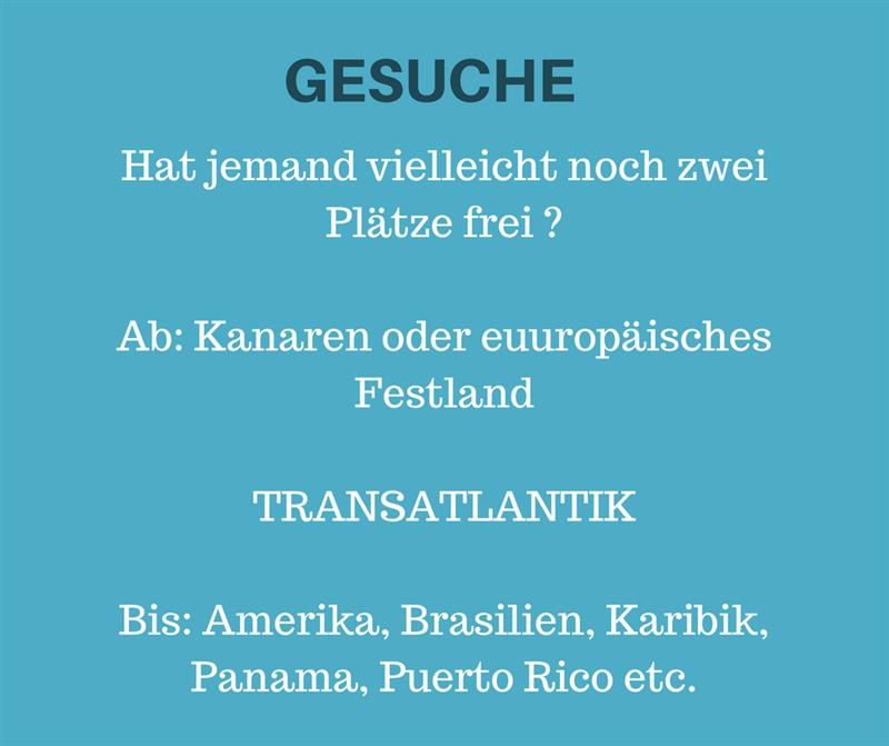 Wir zwei haben leider noch keine Segelerfahrung, würden jedoch gerne dazu lernen und eine Hilfe sein, wenn wir dafür im Gegenzug ein Stück mitgenommen werden. Egal ob Amerika, Brasilien oder ''nur'' in die Karibik.