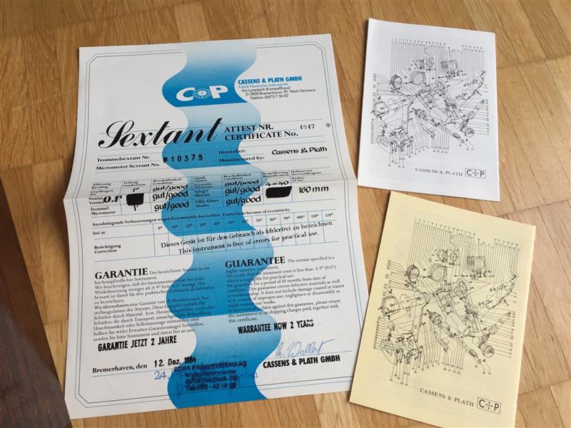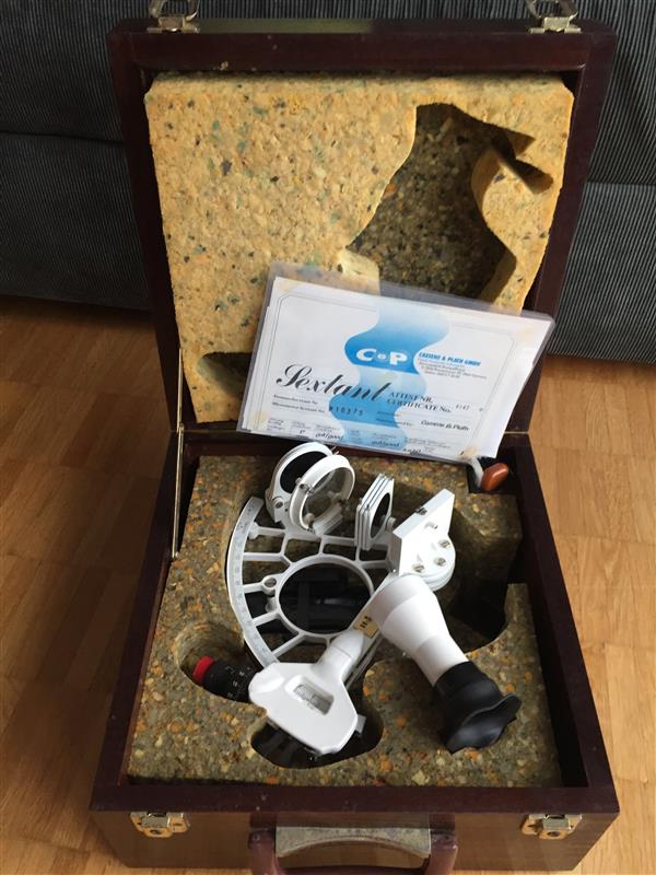Ich habe ein schwerer sehr wenig gebrauchter weisser Cassens & Plath Horizonth Sextant (aus Bronze?) inkl Prüfzertifikat von 1984.So wie ich es beurteilen kann iste er noch völlig in Ordnung. Spiegel, Optik und Schattengläser sehen alle noch einwandfrei aus. Er liegt seit mehr als 15 Jahren in meinem Schrank rum und wurde nie mehr gebraucht. Bei der Beluchtung müsste die Batterie wohl erneuert werden.