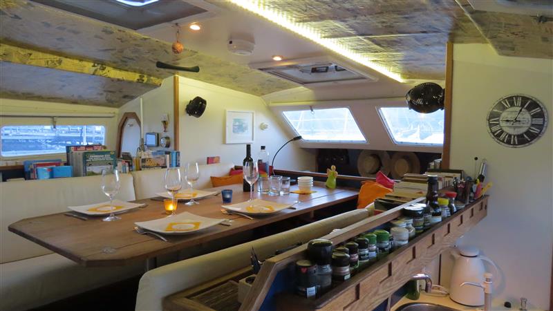 Für den Ausbau wurde bei gestrichenen Flächen Okume AW100 verwendet. Alle Anstriche sind aus Zweikomponenten Polyurethanfarbe. Das sichtbare Holz ist Eiche geölt, Kanten massiv, Böden Sperrholz, alle Lagen Eiche (geliefert von Sommerfeld + Thiele, Deutschland).