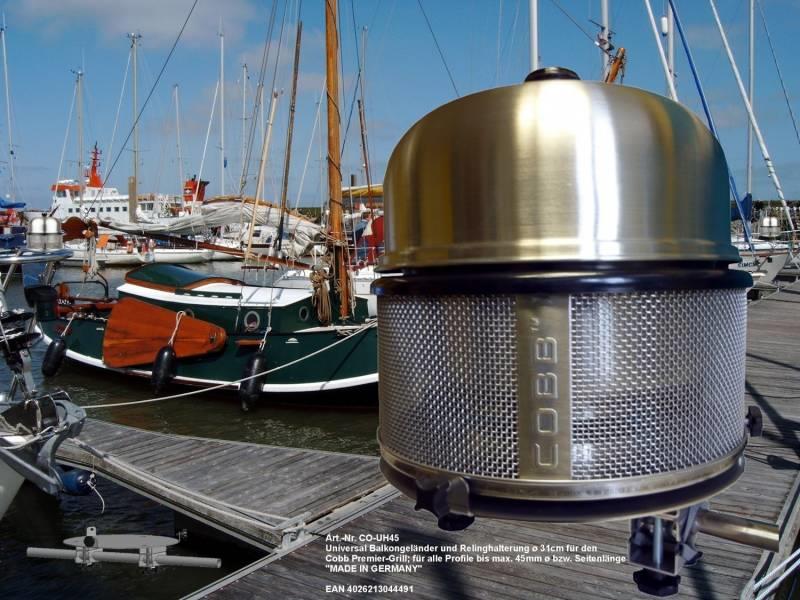 Die Balkon- und Relinghalterung ist eine universell einsetzbare Möglichkeit, dem Cobb Premier Grill eine sichere Plattform auf jeder Reling und den meisten Balkongeländern geben zu können. So können Sie sogar auf Ihrem Seegelboot bei Wind und Wellengang ein perfektes Grillmenü genießen. Auf dem Universaltablett können natürlich auch andere kleine Grillgeräte, Blumentöpfe, Kerzenfackeln, bis hin zum kleinen Bierfass sicher positioniert werden. Die Balkon- und Relinghalterung ist speziell für den Cobb Premier Grill entwickelt und wird in deutscher Qualitätsarbeit extra für Sie angefertigt.