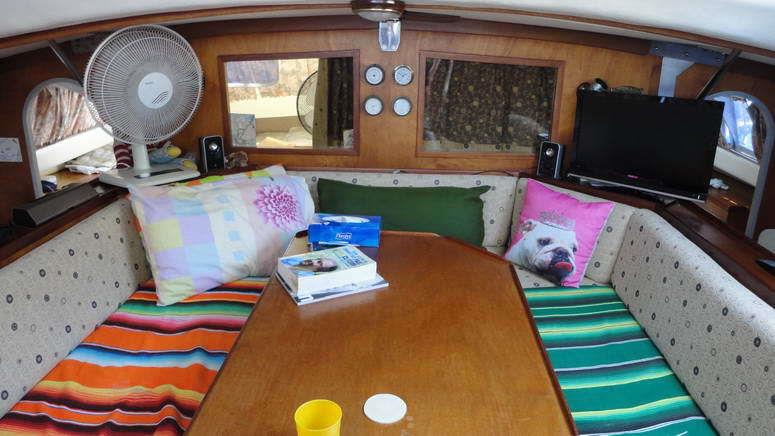 Der Kat ist sehr wohnlich eingerichtet, hat vier Kojen plus 2 Kojen im Salon. Die Pantry ist Steuerbord mit vierflammigem Gasherd und Backofen, Spüle mit Warm- und Kaltwasser, Einbaukühlschrank mit ausziehbaren Schubladen. Vier Gasflaschen.
