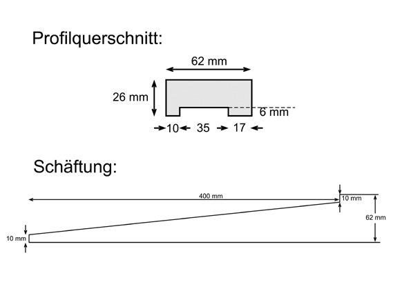 62 x 26 mm, gehobelt. Die Nut ist 6 mm tief und 35 mm breit.